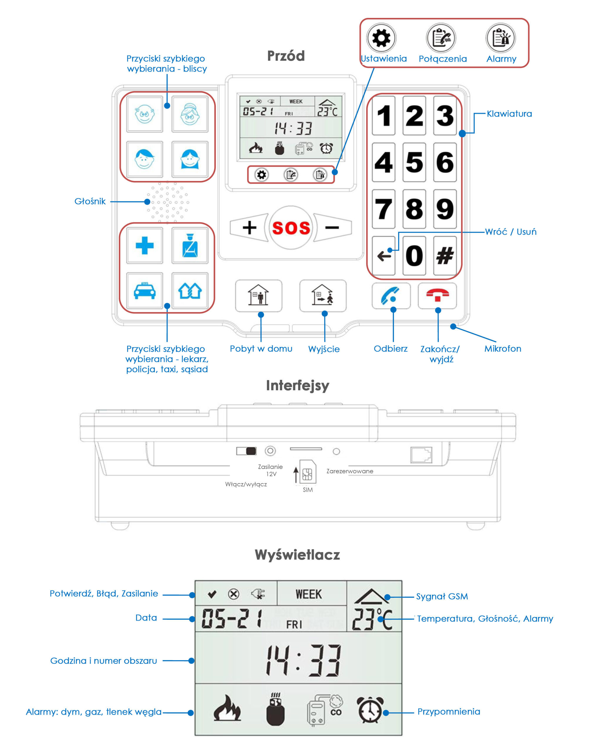 Urządzenie posiada duży przycisk SOS i samodzielnie może pełnić funkcję systemu przywoławczego w przypadku zagrożenia, ale także daje możliwość podłączenia bezprzewodowych czujników.